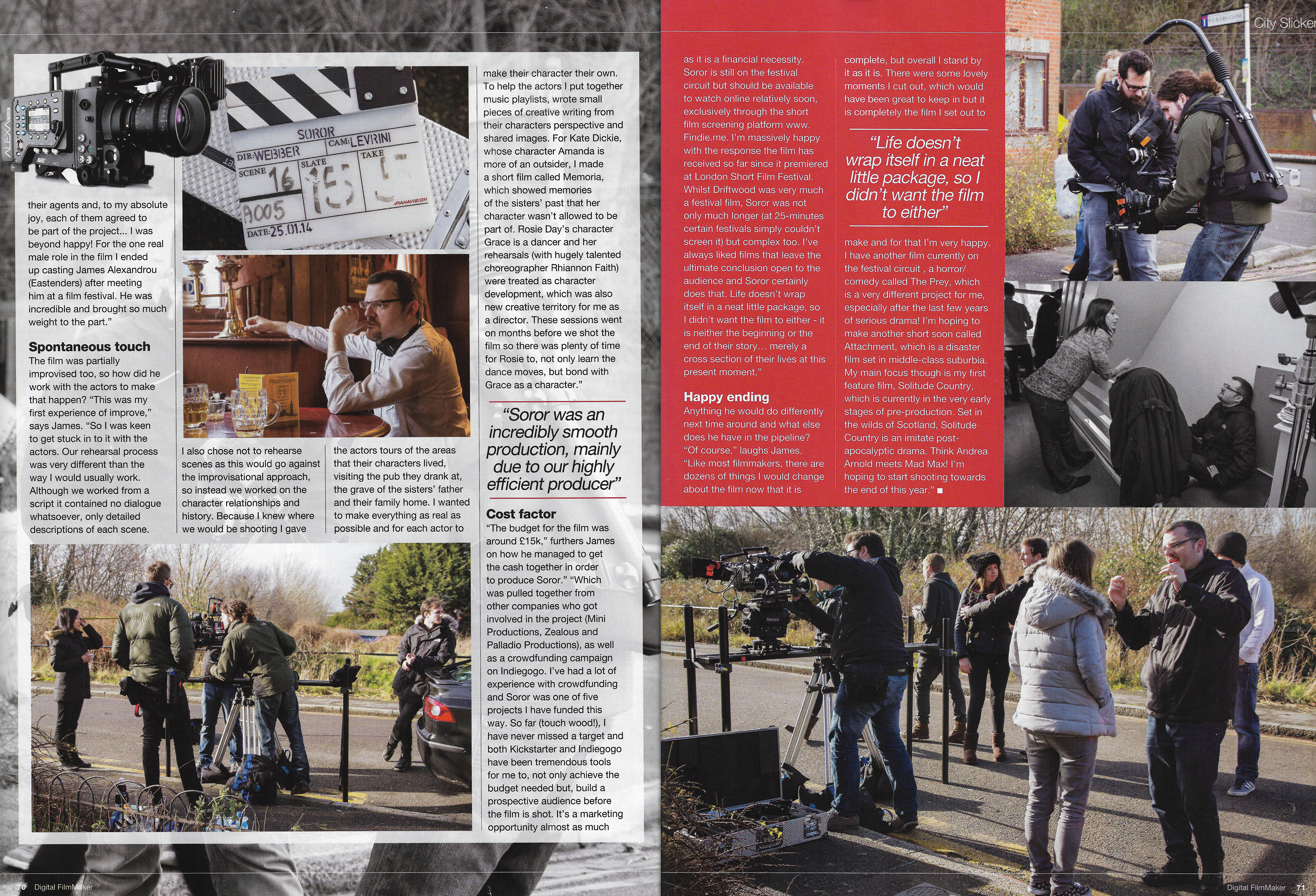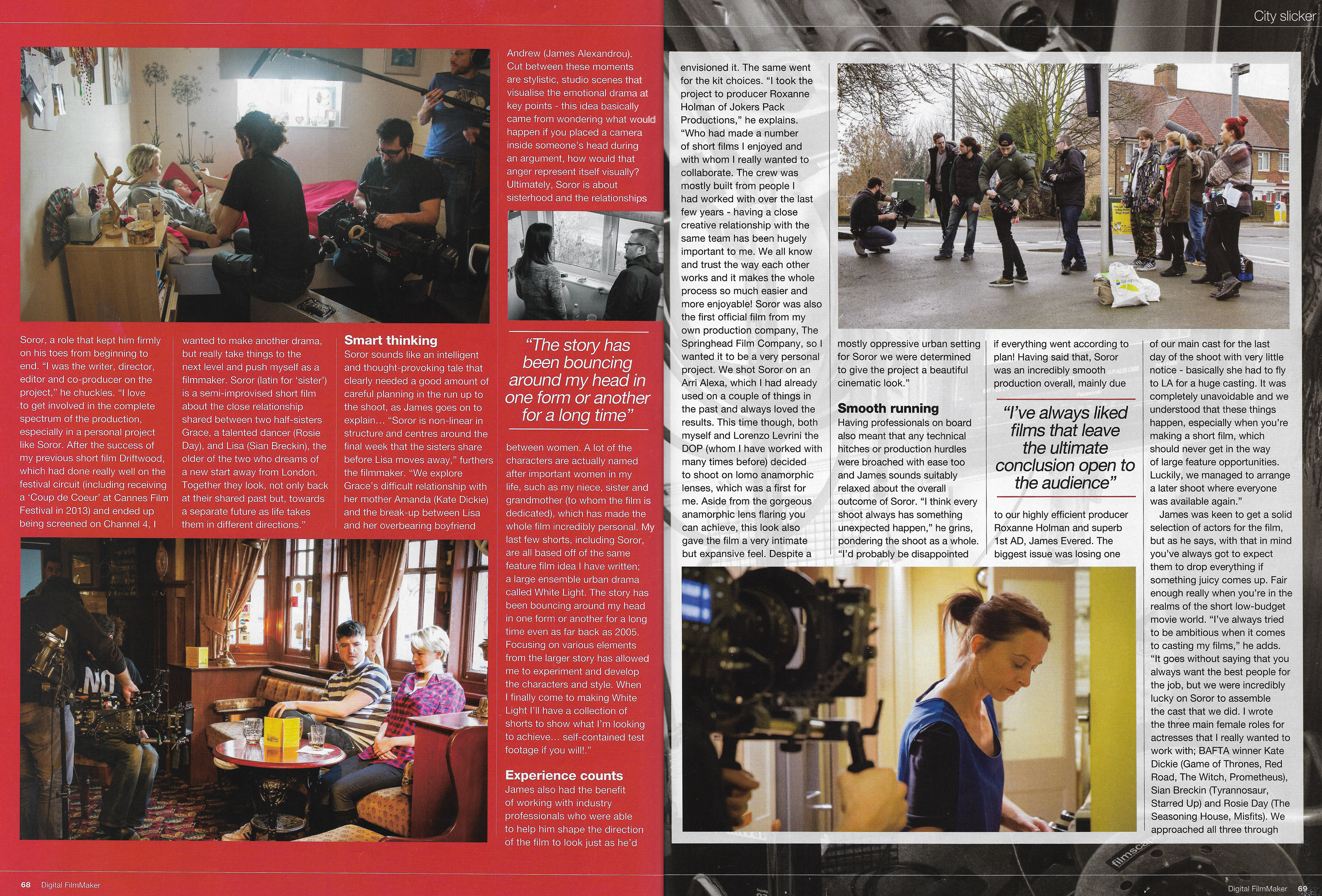 The May issue of Digital Filmmaker Magazine features a six-page-spread on the making of our short film Soror, starring Rosie Day (Outlander, The Seasoning House) Sian Breckin (Donkey Punch, Tyrannosaur, Starred Up), James Alexandrou (Eastenders, Silent Witness) and Kate Dickie (Red Road, Filth, Prometheus, Game of Thrones). The article features an in-depth interview with Soror writer/director James Webber covering the making of the film; from crowdfunding through to the shoot. All photography featured in the article is courtesy of Springhead’s own Poppaea Bicknell.